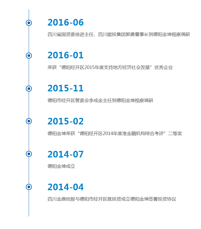 為進一步加快落實四川省能源投資集團與德陽市人民政府于2014年11月簽訂的戰(zhàn)略合作協(xié)議,大力實施金融帶動戰(zhàn)略,助推德陽營造優(yōu)良金融生態(tài)環(huán)境,解決中小微企業(yè)融資難、融資貴、融資慢問題,2015年12月4日,四川金鼎產(chǎn)融控股有限公司、德陽金坤公司分別與國家級德陽經(jīng)濟技術開發(fā)區(qū)簽訂戰(zhàn)略合作協(xié)議,擬定十三五期間向經(jīng)開區(qū)投融資40億元,并共同發(fā)起成立一支規(guī)模為10億元的產(chǎn)業(yè)基金,雙方將在產(chǎn)業(yè)基金、融資租賃、融資擔保、信貸融資、小額貸款等方面進行全方位的綜合金融合作,同時金鼎集團把在德陽地區(qū)幾大金融板塊協(xié)同的試驗工作交與德陽金坤。